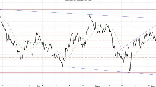 Kurs GBP/PLN porusza się w trendzie bocznym. Po nieudanym testowaniu poziomu 5,0650 czyli maksimów z przed decyzji FED-u kurs zawrócił w dół i przebił dolne ograniczenie trójkąta. W przypadku ruchu w górę jeżeli wybicie się potwierdzi nowym oporem są okolice poziomu 4,9900, czyli przebita właśnie linia łącząca minima sierpnia i września. Dla dalszego ruchu w dół wsparciem jest poziom 4,9500 czyli minima z po decyzji FED-u.