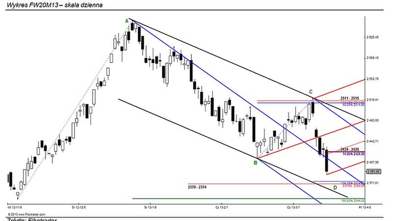 Nieco większe znaczenie w stosunku do wspomnianego zniesienia 88.6% przypisałbym obecnie zakresowi wsparcia: 2370 – 2374 pkt. Wypadają tutaj bowiem projekcje wytyczone na bazie znanego nam już układu ABCD (między innymi 0.618AB = CD). Poddanie również i tej zapory Fibonacciego, to tak naprawdę zapowiedź powrotu kontraktów w okolicę listopadowego dołka cenowego (poziom 2344 pkt.).