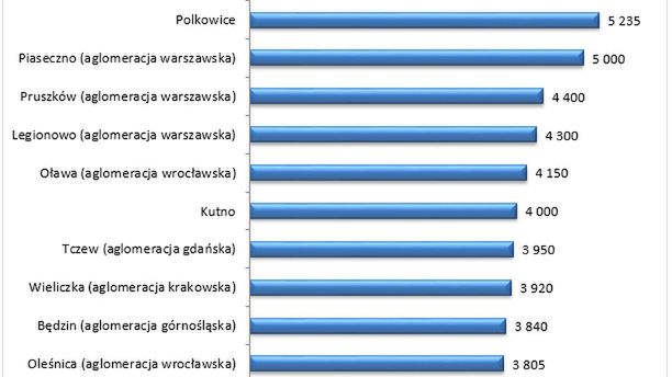 Na wykresie 2. przedstawiono małe miasta, w których mediana wynagrodzeń była najniższa w 2012 roku. Na ostatnim miejscu znalazły się ex equo Chełm, Ełk oraz Zamość. Przeciętna pensja w tych miastach wyniosła 2 700 PLN brutto miesięcznie. Warto zwrócić uwagę na to, że w tej grupie znalazło się tylko jedno miasto „aglomeracyjne”. Był to Zgierz, położony w bezpośrednim sąsiedztwie Łodzi. Mediana płac wyniosła tam 2 900 PLN.