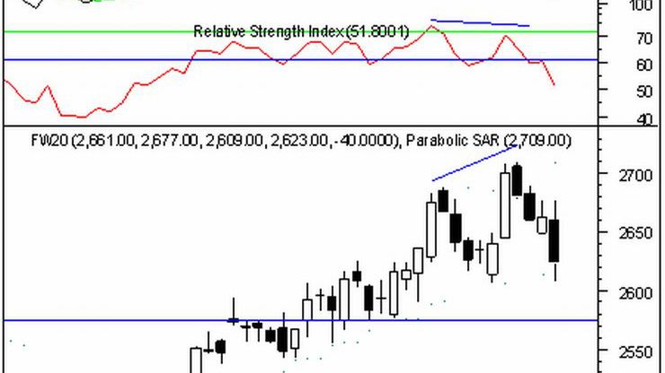 Niestety, pomimo nadziei na szybki powrót optymizmu, wtorkowa sesja rozwiała wątpliwości. Inwestorzy na rynku terminowym wyraźnie obrali kierunek na południe. Seria kontynuacyjna kontraktów terminowych na indeks WIG20 zamknęła dzień na 1,5% minusie. Na wykresie została wykreślona czarna świeca z dużym korpusem i obustronnymi cieniami, umiejscowiona poniżej poprzedniej. Swoim zasięgiem pokryła prawie w całości dwie białe świece z początku zeszłego tygodnia, tym samym zbliżając się do wsparcia na 2 606 pkt. Wybicie dołem poniżej wsparcia sprowokuje dalszą przecenę, której potencjał może sięgnąć nawet 2 575 pkt. Dodatkowo osłabienie nastrojów znajduje już uzasadnienie w opadającym ADX, co może pogorszyć nastroje w szerszym zakresie czasu. Korelując powyższe czynniki z realizującą się dywergencją bessy, popyt będzie musiał zmierzyć się dzisiaj ze wzmożoną siłą sprzedających.